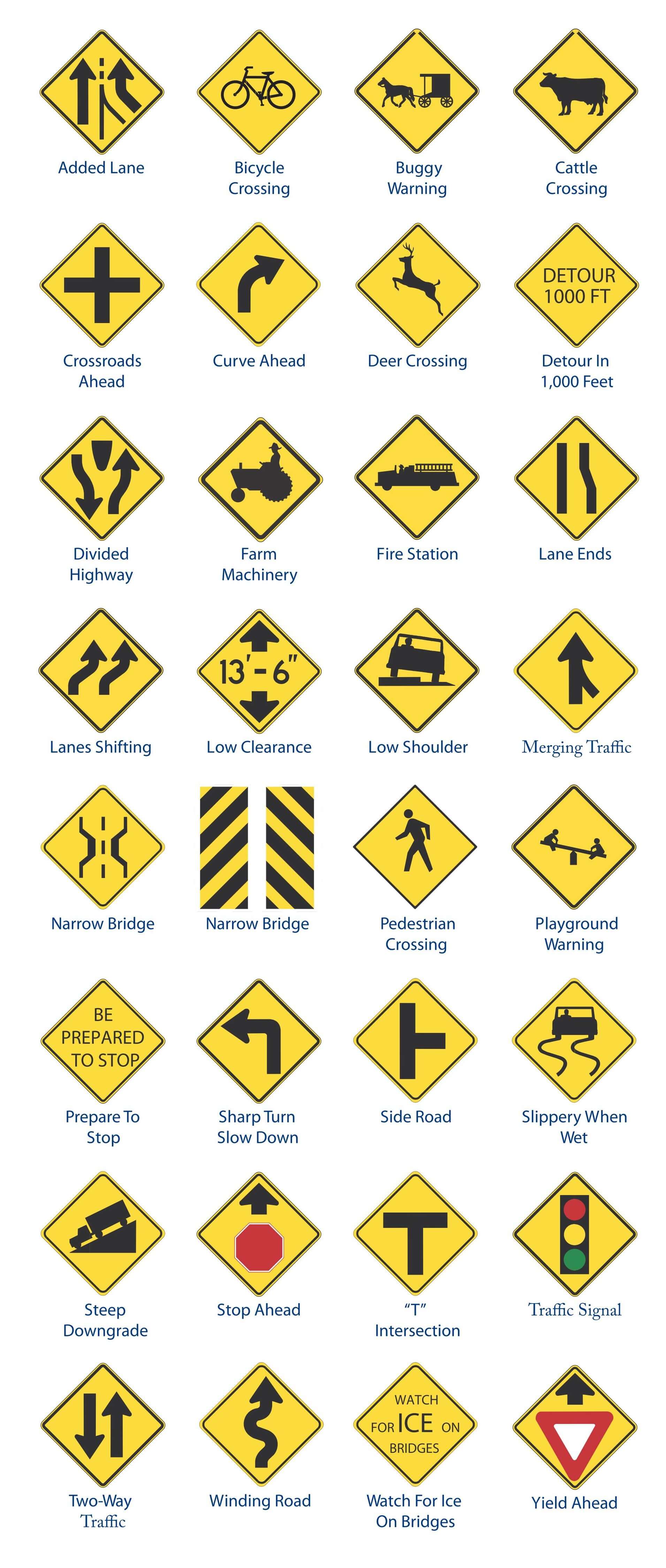 Tags: Added LineBicycle CrossingBuggy WarningCattle CrossingCrossbonesCurve AheadDeer CrossingDivided HighwayFarm MachineryFire StatitonLane EndsLanes ShiftingLow ClearanceLow ShoulderMerging TrafficNarrow BridgepanelPedestrian CrossingPlayground WarningPrepare To StopSharp TurnSide RoadSlippery When WetSlow TownSteep DwongradeStop AheadtrafficTraffic SignalTraffic SignsTraffic WarningTwo-Way TrafficwarningWatch For Ice On BridgesWinding RoadYield Ahead